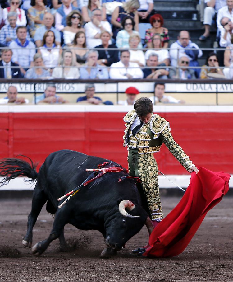 Temps chaud et ensoleillé, trois-quarts d'entrée. Bilbao est toujours sur la réserve et ne remplit pas les tendidos même lorsque viennent les figuras. Toutefois les absents auront eu tort de ne pas se joindre au rituel aujourd'hui. En effet Victoriano del Rio a envoyé à Bilbao un grand toro "Ruiseñor" n°42, un exemplaire à la cape variée qui a poussé sous le fer et est allé a más dans le combat de forme notable. Face à lui José María Manzanares a sorti le grand jeu à droite, mais a tué sans briller. Le public quant à lui est sorti de Vista Alegre joyeux et satisfait. Le lot comprenant deux Toros de Cortés a offert de bons moments aux toreros et au public.