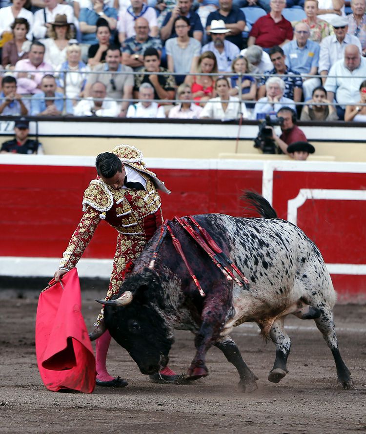 Antonio Ferrera dessine des véroniques plus techniques qu'artistiques et termine par demie sur jambe pliée. Le victoriano-del-río, très mal piqué, en carioca et en arrière, entre dans les leurres sans conviction et tête relevée. Le début de faena par tanteo confirme indolence et faiblesse du toro. Sans le brusquer Ferrera tire des lignes à mi-hauteur qu'il incurve progressivement. À gauche quelques naturelles "al hilo" ressortent d'un ensemble monotone. À l'épée le bicho ferme la porte sans "humilier" et Ferrera porte un pinchazo puis une entière caída en restant sur la face. Descabello. Silence.