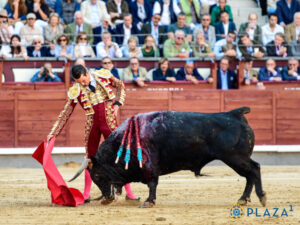 Le cinquième de la Ventana del Puerto est le moins bien présenté ce qui explique le brouhaha venant du T7. Ses charges sont retenues et le travail de cape de Román adapté aux circonstances. Le toro pousse brièvement avant de sortir seul de la pique. La seconde plus longue est subie avec carioca. Brindis personnel. Les passes de costadillo sont suivis de passes en ligne, par le haut. Les derechazos sont lointains et les naturelles en ligne fades, face à un calamocheo gênant. Dans la série suivante à droite le torero fait l’effort pour se recentrer. La sortie de passe du toro manque de classe et d’entrega. Román insiste à droite et termine par des naturelles pied joints et de face volontaires. Demi-lame caida. Silence.