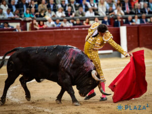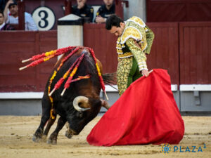 Le second d’Emilio de Justo est un tío. Le matador tente de toréer en véroniques mais le toro bondit au passage de la cape en donnant un coup de tête. Piqué trasero, le bicho s’emploie, puis rechigne face à la seconde pique dont il sort promptement. Quite de ARR par tafallera, medio farol et caleserina mécaniques. Le début de trasteo le long des planches se construit par doblones dans lesquels le bicho trébuche à plusieurs reprises. Les derechazos enchaînés vont a más, un d’eux profond. L’animal répond. La troisième série, seconde complète, transmet. La suivante n’a plus la même intensité et le positionnement du matador est marginal. Une naturelle ressort d’une série gauchère qui manque de rythme. Idem dans la suivante avec la dernière naturelle et le pase de pecho supérieurs. Toréant sans ayuda à droite, il y a connexion avec les tendidos, comme avec les muletazos de remate de faena donnés vers les tablas. Entière desprendida. Oreille et applaudissements au toro.
