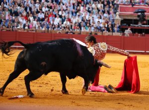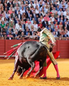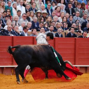 Andrés Roca Rey donne des véroniques en ouvrant beaucoup la cape mais en enchaînant une série appréciée du public. Le toro est lavado de cara et juste de trapío. Le tercio de varas, à l’image du toro, est léger. Au second tiers, le bicho galope et se plaint des banderilles. Il charge par soubresauts. Brindis au public. A genoux, au centre ARR "cite" longuement pour deux péndulos et un final debout qui enflamment la Maestranza. Musique. Les derechazos s’enchaînent depuis les lignes parallèles dans un exercice d’imposition de trajectoires. Les charges du toro sont magnifiques à gauche, et ce jusqu’à la fin du muletazo en retournant la tête vers la toile qui se retire. Les naturelles privilégient le lié à la profondeur. Le Péruvien tire au maximum sur ce qui reste de la charge jusqu’à l’arrimón et même la perte de respect à l’opposant ce qui lui vaut une voltereta. Des bernardinas serrées sont suivies d’une estocade entière desprendida. Deux oreilles demandées et accordées.