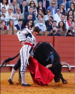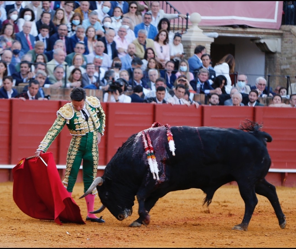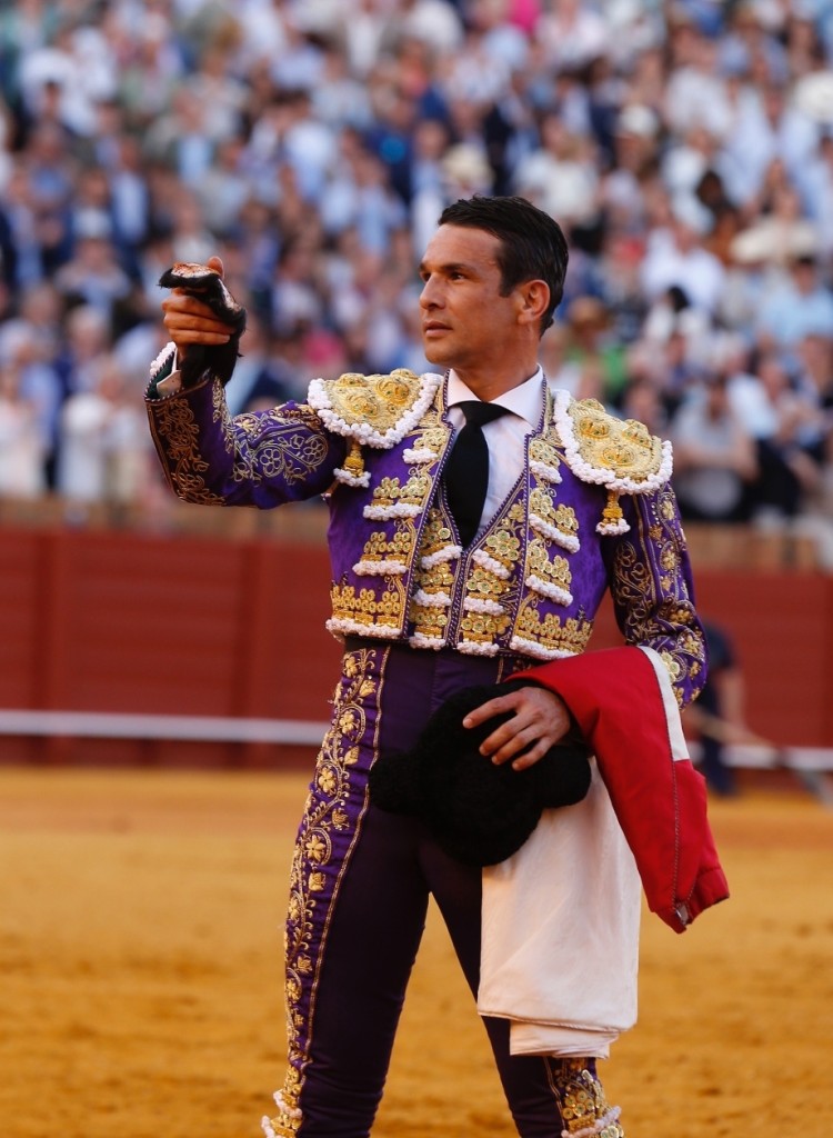 Morante de la Puebla allume la mèche avec la cape dès les premières charges du Vegahermosa dans des véroniques qui arrachent les olés des Sévillans. La mise en suerte au cheval dit que Morante aime le comportement mansito du toro, qu’il fait à peine piquer. Les quites du maestro et de Diego Urdiales attestent des qualités mais aussi de la faiblesse de l’opposant. L’entame de faena par ayudados est somptueuse, mais la molesse du bicho empêche l’explosion des âmes. Les derechazos au ralenti souffrent de la même absence d’intensité. À l’occasion, le public se laisse griser, malgré la molesse du toro Vigahermosa. Sur la corne gauche, l’animal a du mal à suivre les superbes naturelles du maître. La musique ne joue que quand la faena est terminée. Demi-lame avec avis. Pétition d'oreille et salut.