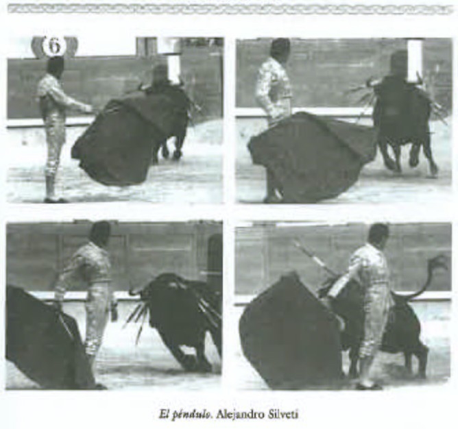Mais alors qu'en est il du "Pase del Péndulo" ? Peut-on dire qu'il est un "pase cambiado" à la lumière des considérations techniques que nous venons de mettre en évidence? Je suis de l'avis que non. Dans cette passe le Torero donne la sortie du coté de la main qui tient la muleta. La muleta est portée derrière le profil droit et n'est bougée que d'avant en arrière, toujours du même coté droit du Torero lors de l'exécution de la passe sans croiser devant ou derrière le corps pour aller vers la main ne tenant pas la "Muleta". Au contraire, dans le dernier temps de la passe le bras droit s'élève et s'éloigne du corps sur le même coté droit.