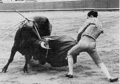 Manolete, El Monstruo, comme Ricardo García «K-Hito» l'avait surnommé au soir d’une corrida triomphale à Alicante en 1944, était reconnu comme un superbe estoqueador. La définition de la suerte suprema se résume dans ses propres paroles : il faut entrer court (s’étant placé à courte distance du toro - NDLR), lentement et s’exposer de telle sorte que la corne droite ne doive passer à plus de # 20 cm (cuarta = empan) du corps du torero. Rarement il se départait de ces préceptes et confirmait que, en se croisant, c’était la muleta et la main gauche qui esquivait le danger et qui tuait. Sa sincérité, son entrega, lui coûtaient de nombreuses cogidas en portant l’estocade jusqu’à la dernière, en mettant à mort « Islero ». (Photo ci-dessus)