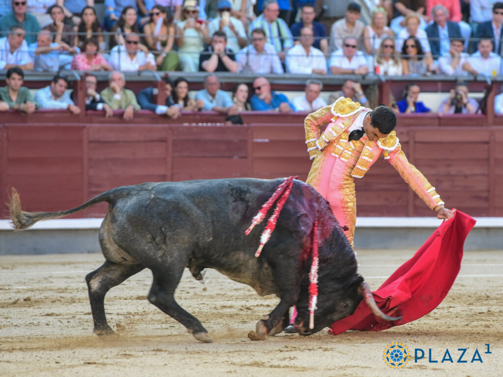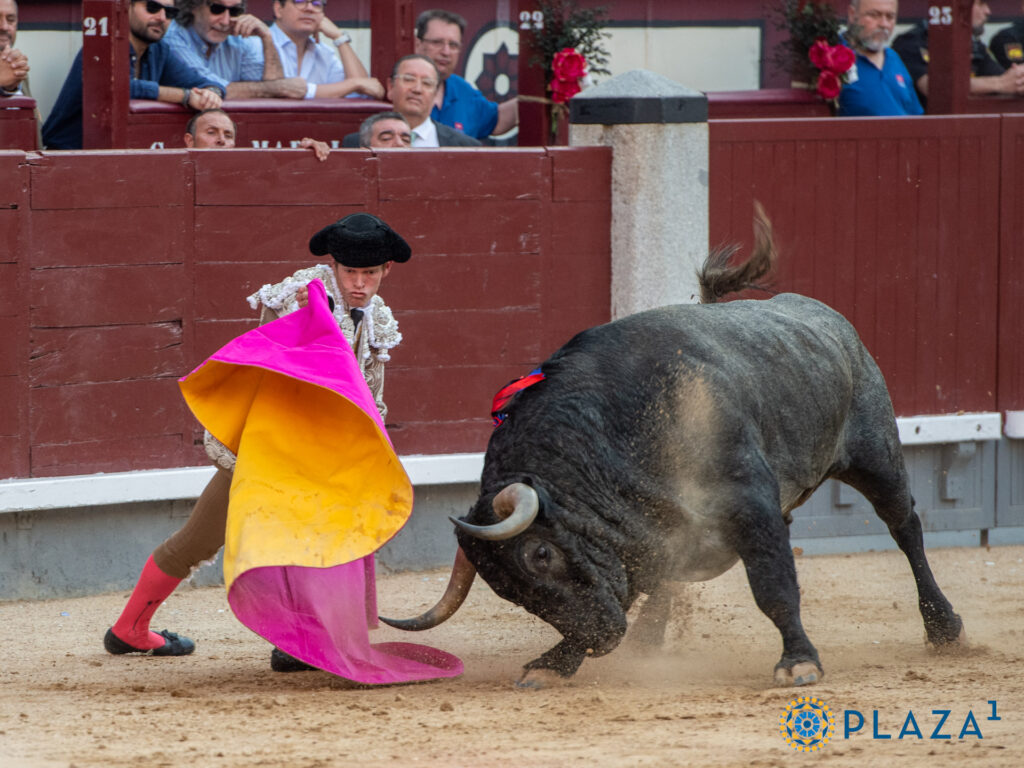 Borja Jiménez, héros du jour, recevait “Milhijas” par des véroniques, jambes semi-fléchies  l’amenant ensuite au centre de la piste. Le toro s’élançait vers le cheval pour une pique de côté (protestations), la seconde étant mieux placée et ovation au picador Germán González. La cuadrilla -  bonnes paires de banderilles de Vicene Varela - ménageait ce toro… La faena débutait par des naturelles que Borja dessinait avec aguante d’autant plus méritoires que la charge du toro ne permettait aucune hésitation, charge “humiliée”, répétée, s’ouvrant sans exagération mais la tête toujours par le bas. Une autre tanda de même intensité et la suivante demandaient un repositionnement du torero pour enchaîner les passes sous l’emprise de la fougue du toro. Sur la droite, les passes étaient longues moins rapprochées et le trasteo, à ce moment-là, moins compact. La série suivante, avec remate par molinete et passe de poitrine, le tout lié, rehaussait le niveau de la faena. Les passes par le bas, pour finir, du goût du public madrilène, un pase del desdén, précedaient une grande estocade. Un avis sonnait car le toro tardait, blessé mortellement, à s’effondrer. Les deux otreilles était accordées en raison de l’unanimité et enthousiasme du public. Mouchoir bleu pour le tour de piste de la dépouille du brave toro. A son premier, Borja Jiménez, devait gérer non seulement le passage du toro dans sa cape et muleta mais aussi la faiblesse du train arrière de l’animal – visible lors de la suerte de varas – et sa charge hésitante et incertaine. Il passait mieux sur la gauche mais la perte d’équilibre obligeait Borja à prendre l’épée pour… un bajonazo!